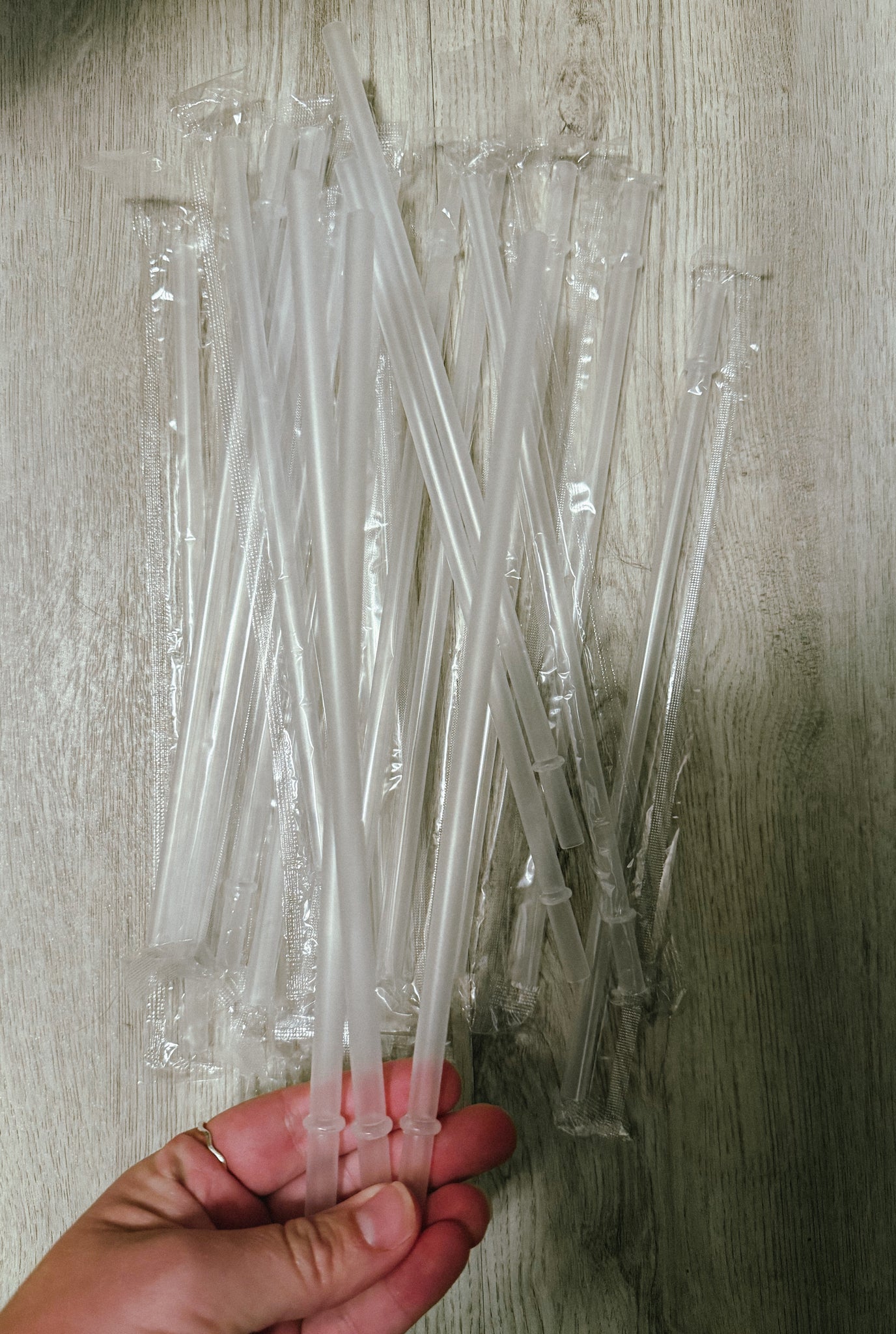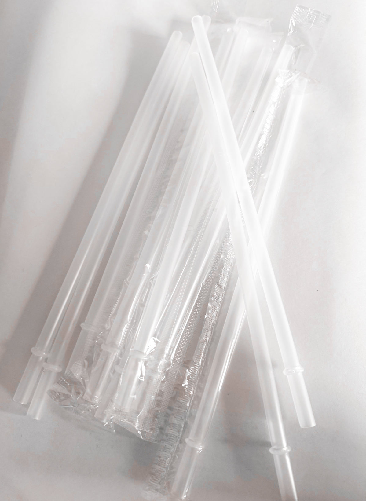 PLASTIC STRAWS: Roughly 10.5 inches long. Clear/White.