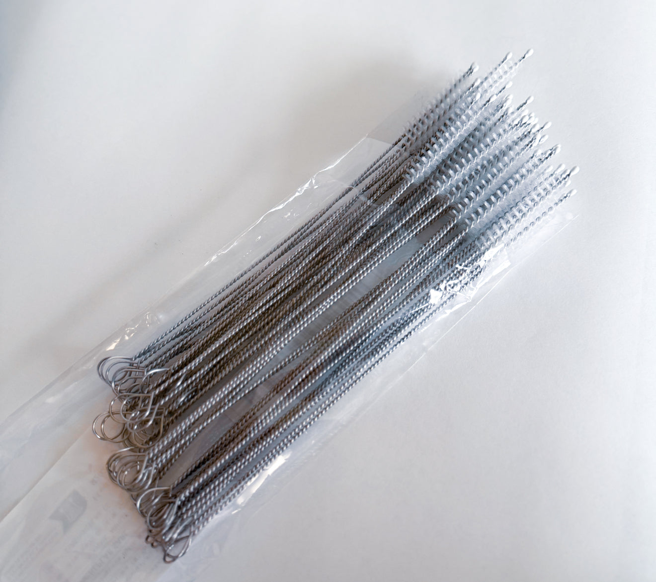 STRAW CLEANER BRUSH: Roughly 6.25 inches long. Metal Handle with a bristle top.